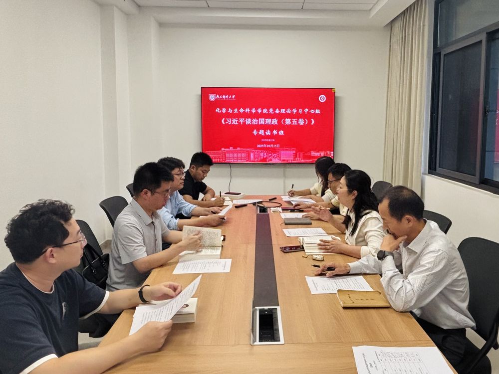 会后,化生院党委理论学习中心组成员按照学校部署要求开展《习近平谈治国理政(第五卷)》专题读书班进行集中学习,原原本本研读著作重要篇目。乔祖琴书记在学习中提到,中心组成员要切实发挥带头作用,将理论学习与学院学科建设、人才培养、科研攻关紧密结合,以学铸魂、以学增智、以学正风、以学促干;各基层党支部要通过“三会一课”认真学习,切实把学习成效转化为推动学院高质量发展的生动实践,努力为学院改革发展稳定与学校“双一流”建设贡献化生力量。