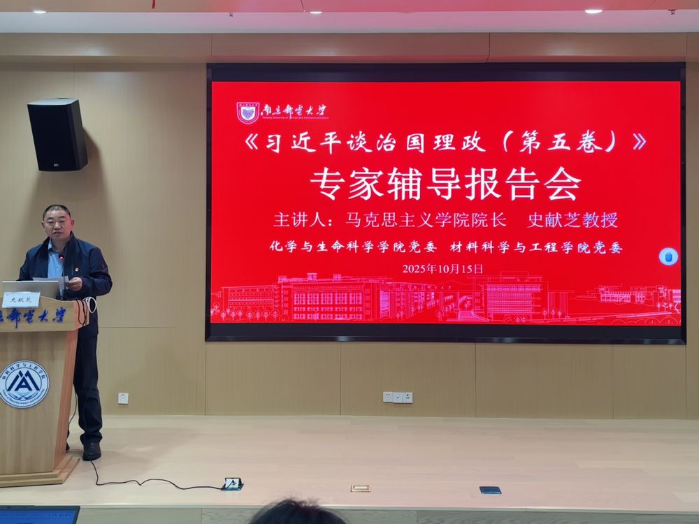 为深入学习贯彻习近平新时代中国特色社会主义思想,推动理论学习走深走实,10月15日,化学与生命科学学院党委、材料工程与科学学院党委结对举办《习近平谈治国理政(第五卷)》专家辅导报告会暨专题读书班,读书班邀请到南京邮电大学马克思主义学院院长史献芝教授做专题报告会。两院理论学习中心组成员和全体教师党员参会,报告会由化生院党委书记乔祖琴主持,材料院党委书记高志华做总结并提出开展本次专题读书班的学习要求。