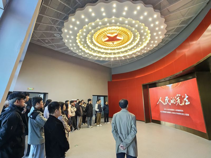 师生们参观了宪法宣传教育展馆,在讲解员引导下,沿“寻宪、制宪、修宪、奉宪” 展线系统学习。从新民主主义革命时期的法治探索到现行宪法的发展完善,336张图片与106件展品全景呈现了中国宪法发展历程。在多媒体互动区,师生通过趣味演绎项目直观理解宪法条文,打破了法律知识的晦涩感。