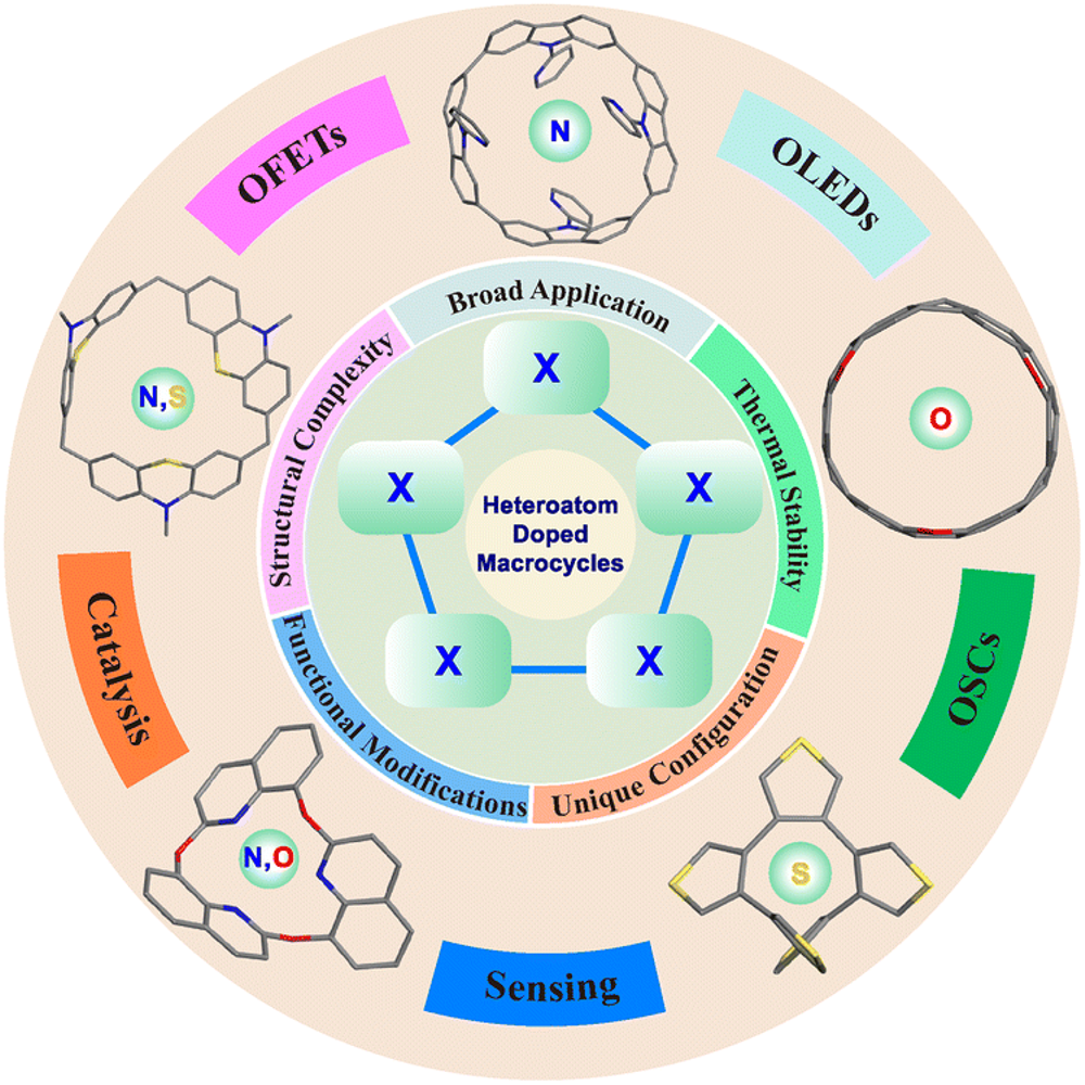 本综述重点介绍近年来在杂原子掺杂(如N、O、S单掺杂及N,O-、N,S-共掺杂)碳大环的合成与应用方面取得的研究进展。综述将涵盖使用Pd、Ni、Pt、Cu、Ti、Sn、Fe等催化剂构建多样化大环骨架的金属催化大环化反应,同时强调包括酸性(Lewis酸和Brønsted酸)及碱性条件在内的无金属合成策略。此外,还将介绍通过进一步转化获得新型大环的方法。最后,将介绍这些掺杂碳大环在主客体化学、传感、有机发光二极管、有机场效应晶体管、(光)催化以及有机太阳能电池等领域的应用。我们相信,本综述将为杂原子掺杂碳大环领域的新进展铺平道路,并为化学、材料科学、生物学及相关学科的研究者提供有价值的参考。