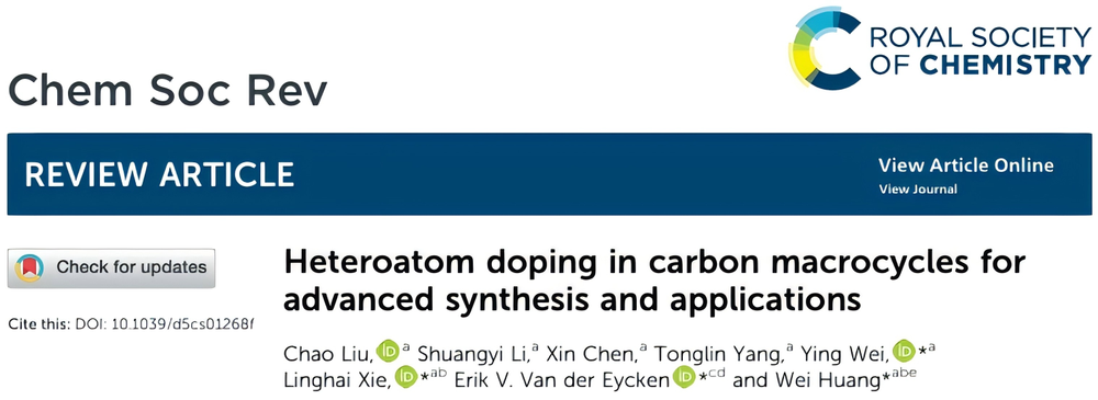 近日,柔性电子全国重点实验室、化学与生命科学学院黄维院士、解令海教授团队与比利时荷语鲁汶大学Erik V. Van der Eycken教授合作,在国际化学领域顶尖期刊Chemical Society Reviews(IF: 39.3)上发表题为“Heteroatom doping in carbon macrocycles for advanced synthesis and applications”的综述文章(DOI: 10.1039/d5cs01268f)。南京邮电大学青年教师刘超为论文第一作者,黄维院士、Erik V. Van der Eycken教授、解令海教授、魏颖副教授为论文共同通讯作者,化学与生命科学学院2023级硕士研究生李爽仪同学在文章构图润色方面做出重要贡献。