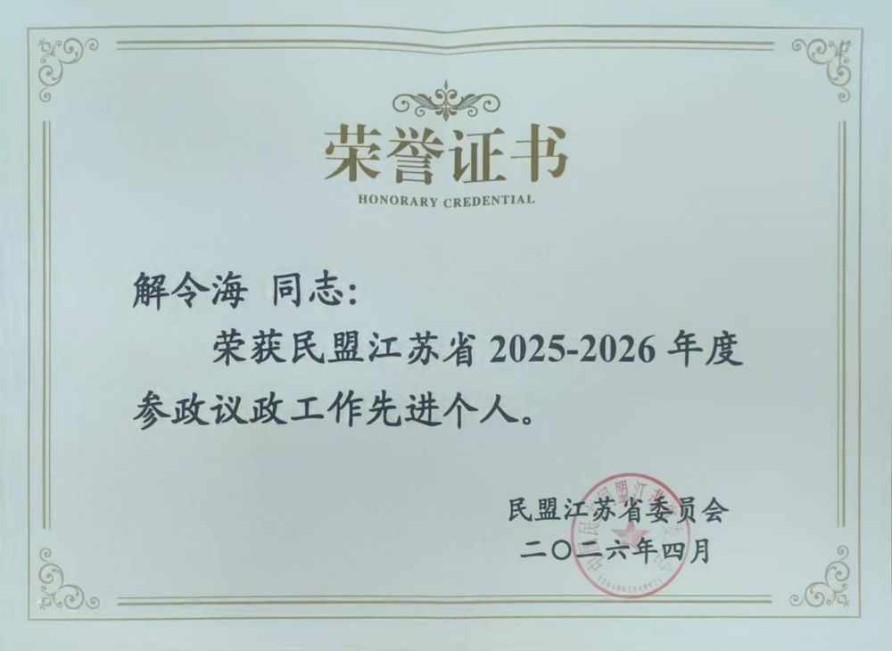 此次获评省级先进个人,是民盟江苏省委会对解令海教授履职成效的充分肯定,也是对南京邮电大学统一战线工作和基层盟组织建设的高度认可。今后,解令海教授将继续带领民盟南京邮电大学委员会坚持正确政治方向,强化思想政治引领,提升参政议政工作质效,深化特色品牌建设,引导广大盟员立足本职、双岗建功,为学校事业高质量发展和中国式现代化江苏新实践作出新的更大贡献。